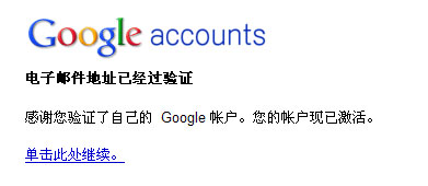 注冊成功之后,google會向你注冊的郵箱地址發(fā)送電子郵件,這時請到你注冊的郵箱中查收郵箱并且激活鏈接。點擊“單擊此處繼續(xù)”進行第二步。