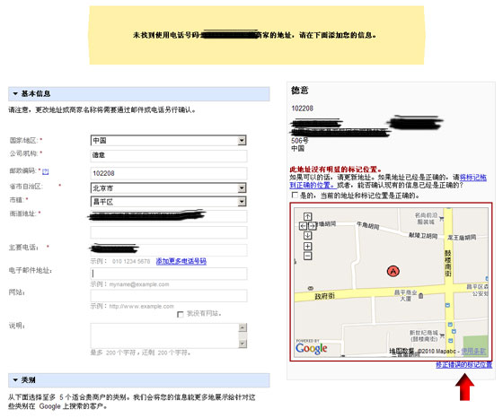在下面這個頁面中如實地填寫企業(yè)的相關(guān)資料,并在右側(cè)的預(yù)覽中檢查自己是否有大馬哈,填寫的信息是否正確,如果發(fā)現(xiàn)位置出現(xiàn)錯誤的話,請點擊紅色箭頭處的“修正錯誤的標記位置”鏈接進行修正。記得勾選右側(cè)預(yù)覽中“是的,當前的地址和標記位置是正確的。”