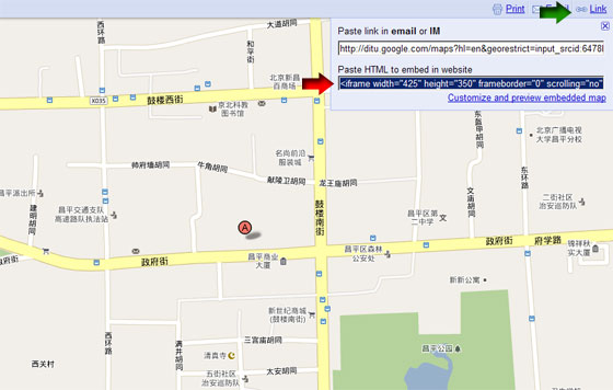 彈出的新網(wǎng)頁會顯示屬于自己企業(yè)的地圖了,這個時候證明你已經(jīng)大獲全勝了,別急,再點擊網(wǎng)頁右上角“Link”鏈接(下圖綠色箭頭處),彈出可以為網(wǎng)頁嵌入代碼(下圖紅色箭頭處),拷貝框中的代碼到相關(guān)的企業(yè)網(wǎng)站頁面即完成了,建議放在聯(lián)系主要的網(wǎng)頁中。